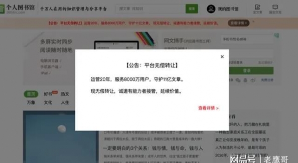 #360doc无偿转让#一则公告,勾起无数老网民的青春记忆。运营超20年、服务8000万用户的“网络个人书房”360doc个人图书馆,近日宣布将全站资产无偿转让,只向接收...