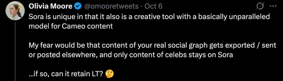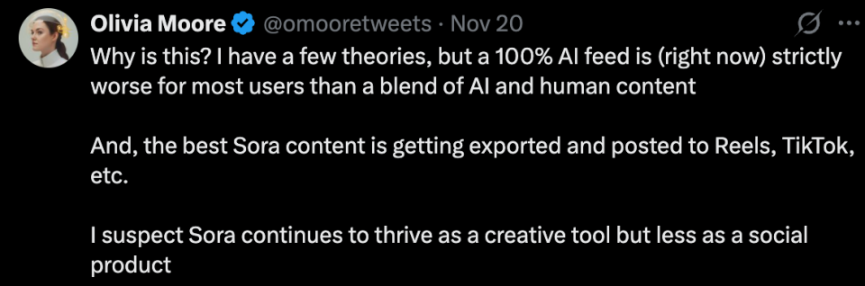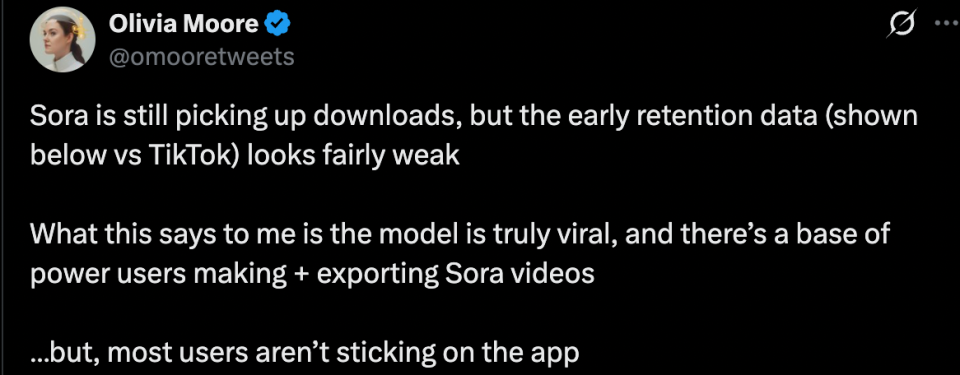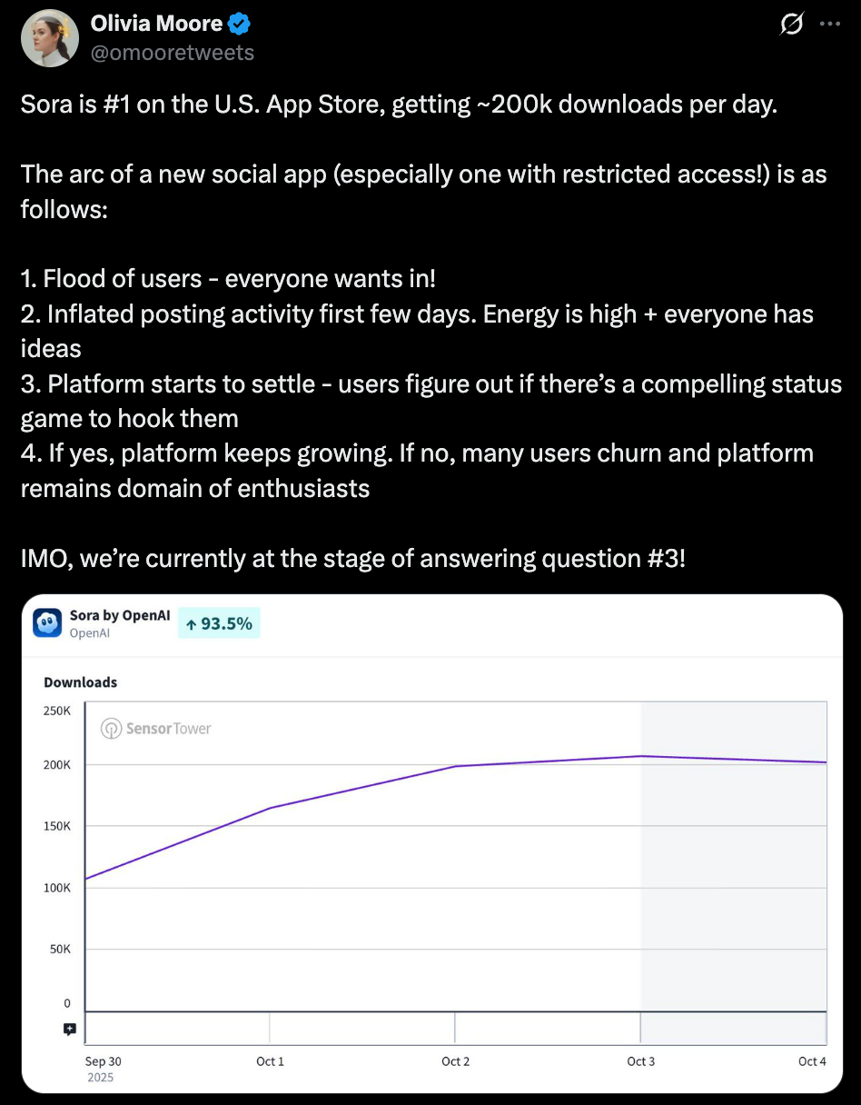 我们摸索出一个提示词:A 14-month-old Eurasian toddler boy with light brown hair, wearing a white onesie, is sitting on the living room floor. A golden retriever puppy barks at him once. The boy sternly points at the puppy and says in clear English with a childish voice, "No! Don’t bark at me! We are friends!" Then he opens his arms and hugs the puppy tightly. The puppy licks his face, and he smiles and says, "We love each other."The scene features cozy, warm lighting, Canon C70-style cinematography, extremely realistic detail, and perfect lip sync.(一名 14 个月大的欧亚混血小男孩,金棕色头发,穿着白色连体衣,坐在客厅的地板上,一只金毛幼犬冲他「汪」了一声,小男孩严肃地指着这只金毛幼犬,用带着童音但清晰的英语说:「不!不要对我叫!我们是朋友!」然后他张开双臂紧紧抱住小狗,小狗舔他的脸,他露出笑容并说:「我们相亲相爱。」 画面呈现舒适温暖的光影、Canon C70 的电影质感、极度真实、口型完美同步。) 以下是 Sora 2 生成效果。 相较于上个版本,Sora 2 在物理真实性、细节呈现和音频同步方面有显著提升。 它能生成与画面高度匹配的对话、音效和 BGM,就连婴儿咿咿呀呀的说话方式生成得都很到位,动作细节也经得起推敲,金毛幼犬摇尾巴、晃动身子的样子完全可以以假乱真。这些细节的写实度已经到了「不说是 AI 生成,可能真会以为是哪个家长拍的家庭录像」的程度。 Veo3.1 整体生成效果也不错,但「演戏」痕迹似乎过重,看着像个广告片。 这几天快手可灵密集上新,推出的 Video 2.6 模型也能实现音画同步。比如下面这个视频即 Video 2.6 模型生成,完成度蛮高,就是萌娃的语音语调像英语听力中的朗读,有点不自然。 萌娃与小狗温馨互动的视频能火,说白了就是精准击中了人性中最柔软的那块地方。小孩与宠物的互动天然具备治愈属性,这种纯粹的情感触动能跨越文化和语言障碍,满足现代人对美好的渴望。 过去,捕捉这类完美瞬间需要大量时间和运气,但 AI 技术的介入让理想画面实现了批量生产,优质内容的供给大幅增加。 而平台算法识别到用户对这类内容的高完播率和互动率后,会自动加大推荐力度,用户观看得越多,推送得越频繁,由此形成持续强化的循环。 在这个信息爆炸、情绪内耗的时代,这种简单纯粹的快乐反而成了最珍贵的奢侈品。 两个月后,Sora APP 留存率归零 既然 Sora 2 能生成如此逼真的视频,按理说应该火得一塌糊涂才对。事实上,Sora 2 上线之初确实凭借强大的 AI 视频生成能力和病毒式传播效应,一度冲上美国 App Store 榜首,每天狂揽 20 万下载量。 不过,短短两个月,热度的退潮比预想来得更快。 近日,a16z 合伙人 Olivia Moore 给 OpenAI 泼了盆冷水。她拿出 Sensor Tower 的数据,把 Sora App 和 TikTok 的留存率放在一起对比,发现 Sora 的下载量还在持续增长,但用户留存率相当疲软:第 1 天只剩 10%,第 7 天 2%,第 30 天 1%,第 60 天直接归零,而 TikTok 同期还能稳在 30% 左右。 ![]() 她得出一个结论,Sora 很火,但留不住大多数用户,真正常用的只有一批核心创作者。 ![]() 下载量依然可观,用户却留不住,这是怎么回事? Olivia Moore 指出,新社交应用通常都会经历这样的过程:一开始用户蜂拥而至,大家都忙着玩、忙着发内容,活跃度爆表,可过几天热度就会慢慢降下来,用户会开始评估「我在这里有没有继续玩下去的理由?能不能在这里比别人更厉害、更受关注?」如果有这种动力,平台就会继续增长;如果没有,绝大部分人会逐渐离开,只剩下一小撮忠实爱好者。 ![]() Sora 的尴尬在于它的双重身份。它既是强大的创作工具,在制作 Cameo 式名人定制视频方面几乎没有对手,但同时又想做社交平台。 问题是,用户生成的真实社交内容都被导出到 Instagram、TikTok 等平台了,留在 Sora 的只有 AI 生成的视频,而没有真实社交圈的内容,那它怎么能长期留住用户呢? ![]() 一个百分之百 AI 生成内容的 Feed 流,体验远不如真人内容和 AI 内容混合的平台,毕竟人们刷社交媒体,是想看真实的人、真实的故事,而不是一堆精美但缺乏温度的 AI 作品,更何况最好的 Sora 内容正在被导出其他平台。 ![]() 换句话说,Sora 更像是一个内容生产工厂,但用户并不想留在工厂里消费内容,他们更喜欢把产品拿到别的地方去展示。这也是为什么 TikTok 早期花了大价钱购买内容,如果你要做「内容社交图谱」而不是「朋友社交图谱」产品,你就需要海量的内容来留住用户。 ![]() Olivia Moore 的判断是:Sora 会继续作为一个强大的创意工具蓬勃发展,但作为社交产品可能就没那么成功了。工具类产品的特点是用户带着明确目的来,完成任务就走,留存率天然不高。从目前的数据来看,Sora 更像是视频创作者的 Photoshop,而不是下一个 TikTok。 参考链接: https://x.com/omooretweets/status/1991273107152334875?s=20 |
