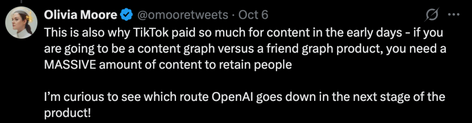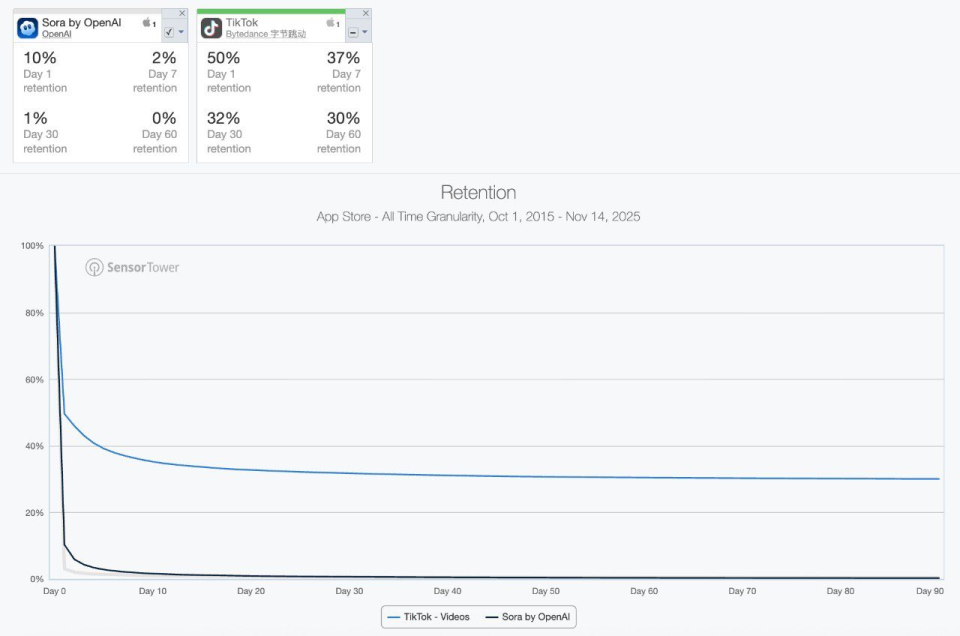 我们摸索出一个提示词:A 14-month-old Eurasian toddler boy with light brown hair, wearing a white onesie, is sitting on the living room floor. A golden retriever puppy barks at him once. The boy sternly points at the puppy and says in clear English with a childish voice, "No! Don’t bark at me! We are friends!" Then he opens his arms and hugs the puppy tightly. The puppy licks his face, and he smiles and says, "We love each other."The scene features cozy, warm lighting, Canon C70-style cinematography, extremely realistic detail, and perfect lip sync.(一名 14 个月大的欧亚混血小男孩,金棕色头发,穿着白色连体衣,坐在客厅的地板上,一只金毛幼犬冲他「汪」了一声,小男孩严肃地指着这只金毛幼犬,用带着童音但清晰的英语说:「不!不要对我叫!我们是朋友!」然后他张开双臂紧紧抱住小狗,小狗舔他的脸,他露出笑容并说:「我们相亲相爱。」 画面呈现舒适温暖的光影、Canon C70 的电影质感、极度真实、口型完美同步。) 以下是 Sora 2 生成效果。 相较于上个版本,Sora 2 在物理真实性、细节呈现和音频同步方面有显著提升。 它能生成与画面高度匹配的对话、音效和 BGM,就连婴儿咿咿呀呀的说话方式生成得都很到位,动作细节也经得起推敲,金毛幼犬摇尾巴、晃动身子的样子完全可以以假乱真。这些细节的写实度已经到了「不说是 AI 生成,可能真会以为是哪个家长拍的家庭录像」的程度。 Veo3.1 整体生成效果也不错,但「演戏」痕迹似乎过重,看着像个广告片。 这几天快手可灵密集上新,推出的 Video 2.6 模型也能实现音画同步。比如下面这个视频即 Video 2.6 模型生成,完成度蛮高,就是萌娃的语音语调像英语听力中的朗读,有点不自然。 萌娃与小狗温馨互动的视频能火,说白了就是精准击中了人性中最柔软的那块地方。小孩与宠物的互动天然具备治愈属性,这种纯粹的情感触动能跨越文化和语言障碍,满足现代人对美好的渴望。 过去,捕捉这类完美瞬间需要大量时间和运气,但 AI 技术的介入让理想画面实现了批量生产,优质内容的供给大幅增加。 而平台算法识别到用户对这类内容的高完播率和互动率后,会自动加大推荐力度,用户观看得越多,推送得越频繁,由此形成持续强化的循环。 在这个信息爆炸、情绪内耗的时代,这种简单纯粹的快乐反而成了最珍贵的奢侈品。 两个月后,Sora APP 留存率归零 既然 Sora 2 能生成如此逼真的视频,按理说应该火得一塌糊涂才对。事实上,Sora 2 上线之初确实凭借强大的 AI 视频生成能力和病毒式传播效应,一度冲上美国 App Store 榜首,每天狂揽 20 万下载量。 不过,短短两个月,热度的退潮比预想来得更快。 近日,a16z 合伙人 Olivia Moore 给 OpenAI 泼了盆冷水。她拿出 Sensor Tower 的数据,把 Sora App 和 TikTok 的留存率放在一起对比,发现 Sora 的下载量还在持续增长,但用户留存率相当疲软:第 1 天只剩 10%,第 7 天 2%,第 30 天 1%,第 60 天直接归零,而 TikTok 同期还能稳在 30% 左右。 ![]() 她得出一个结论,Sora 很火,但留不住大多数用户,真正常用的只有一批核心创作者。 ![]() 下载量依然可观,用户却留不住,这是怎么回事? Olivia Moore 指出,新社交应用通常都会经历这样的过程:一开始用户蜂拥而至,大家都忙着玩、忙着发内容,活跃度爆表,可过几天热度就会慢慢降下来,用户会开始评估「我在这里有没有继续玩下去的理由?能不能在这里比别人更厉害、更受关注?」如果有这种动力,平台就会继续增长;如果没有,绝大部分人会逐渐离开,只剩下一小撮忠实爱好者。 ![]() Sora 的尴尬在于它的双重身份。它既是强大的创作工具,在制作 Cameo 式名人定制视频方面几乎没有对手,但同时又想做社交平台。 问题是,用户生成的真实社交内容都被导出到 Instagram、TikTok 等平台了,留在 Sora 的只有 AI 生成的视频,而没有真实社交圈的内容,那它怎么能长期留住用户呢? ![]() 一个百分之百 AI 生成内容的 Feed 流,体验远不如真人内容和 AI 内容混合的平台,毕竟人们刷社交媒体,是想看真实的人、真实的故事,而不是一堆精美但缺乏温度的 AI 作品,更何况最好的 Sora 内容正在被导出其他平台。 ![]() 换句话说,Sora 更像是一个内容生产工厂,但用户并不想留在工厂里消费内容,他们更喜欢把产品拿到别的地方去展示。这也是为什么 TikTok 早期花了大价钱购买内容,如果你要做「内容社交图谱」而不是「朋友社交图谱」产品,你就需要海量的内容来留住用户。 ![]() Olivia Moore 的判断是:Sora 会继续作为一个强大的创意工具蓬勃发展,但作为社交产品可能就没那么成功了。工具类产品的特点是用户带着明确目的来,完成任务就走,留存率天然不高。从目前的数据来看,Sora 更像是视频创作者的 Photoshop,而不是下一个 TikTok。 参考链接: https://x.com/omooretweets/status/1991273107152334875?s=20 |